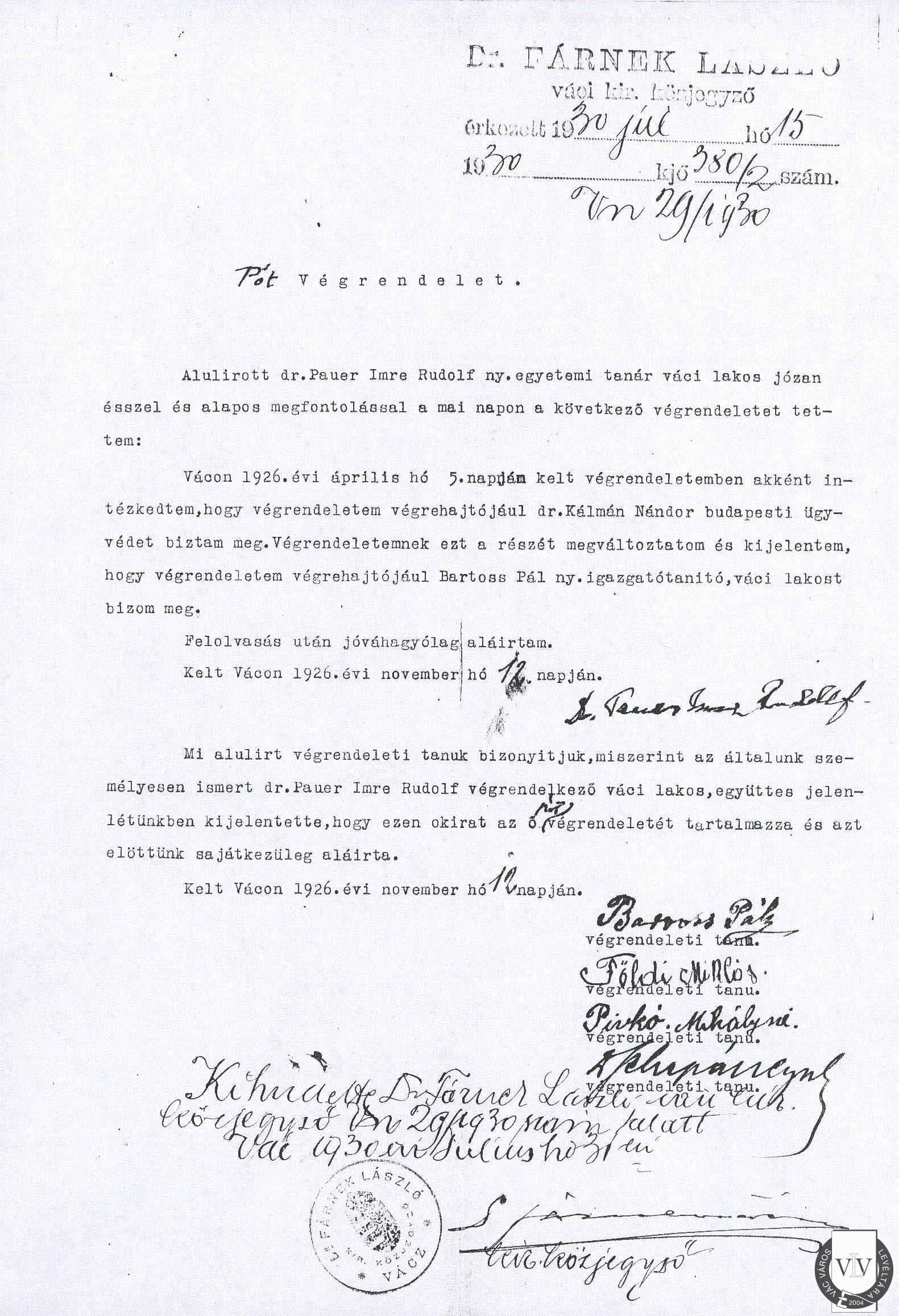 Pauer Imre pótvégrendelete, 1926