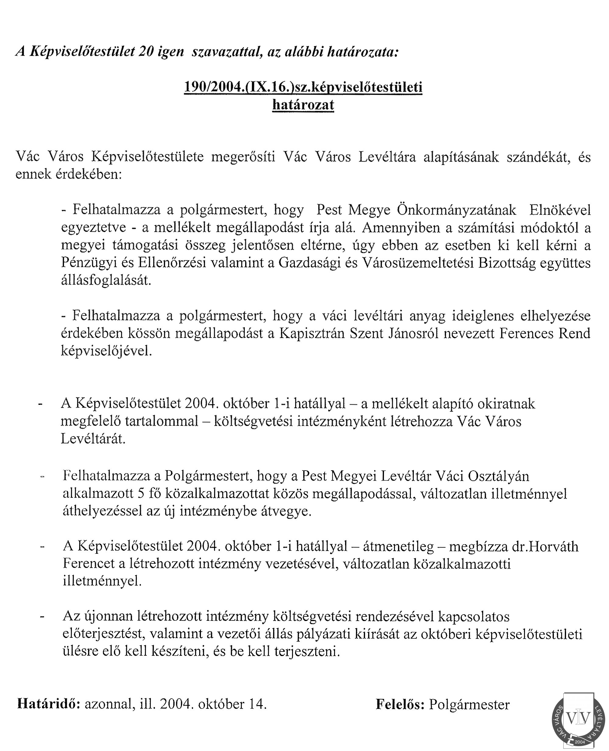 Vác Város Képviselő-testülete határozata a levéltár alapításáról, 2004