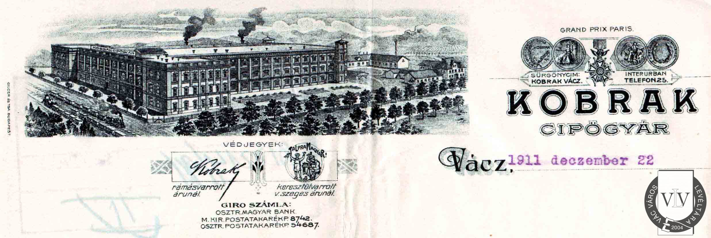A Kobrak Cipőgyár fejléces papírja, 1911